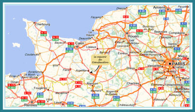50 km südlich von Caen, 65 km vom Meer, 100 km von Le Mans und 200 km westlich von Paris.