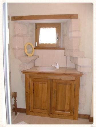 Das Badezimmer-WC ist charmant: begehbare Dusche, Burgunder Steinboden, Waschbecken in Stein, Handtuchtrockner, Haartrockner, Bademäntel.